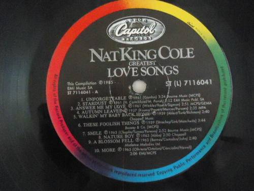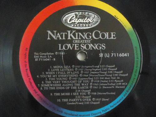 ON OFFER IS THIS NAT KING COLE "LOVE SONGS" 1985 CAPITOL STEREO LP IN V/GOOD CONDITION