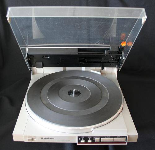 HERE WE HAVE A 1980'S VINTAGE NATIONAL SL-N15 FULLY AUTOMATIC STEREO RECORD PLAYER , TURNTABLE. THIS IS A LINEAR TRACKING TURNTABLE IN THAT THE TONEARM IS FITTED INSIDE THE LID AND RUNS IN A STRAiGHT LINE ACROSS THE RECORD. HIGH TECH IN THE EARLY 80's. IN GOOD 100 % WORKING CONDITION.