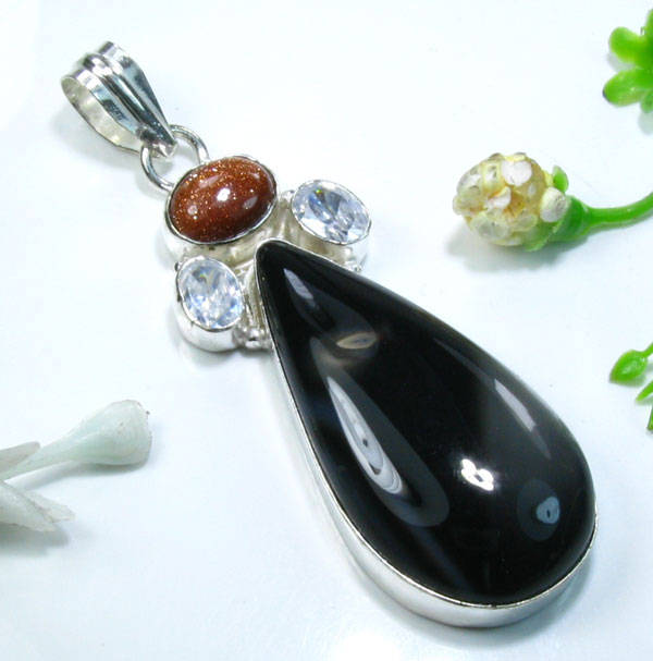 NATURAL BLACK AGATE, SUN SITARA & WHITE TOPAZ .925 SILVER PENDANTPENDANT
