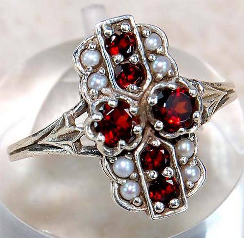 Natural Garnet and Seed Pearl in 925 Solid Sterling Silver Victorian Style Ring Sz 6.5