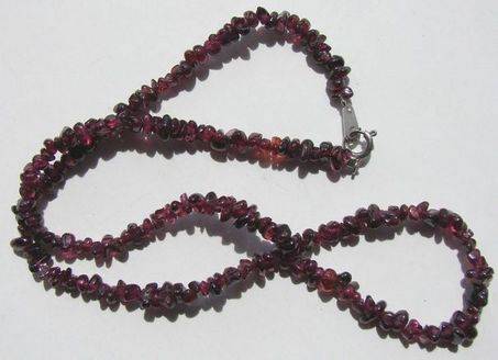 Stone type Natural Garnet Size Varies - avg 5mm to 8mm Length 42cm Type Chips / beads - drilled right through Colour Deep brick red (as per image) Sources India, Russia, USA Quantity One strand / necklace at a time Picture Actual photo