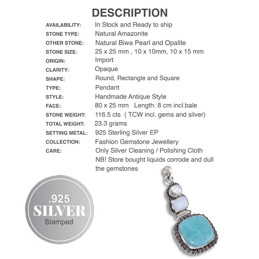 This unique .925 sterling silver pendant is adorned with natural Peruvian Amazonite, Opalite and Biwa pearl stones, creating a stunning piece of jewelry. The antique detailing on the frame enhances the beauty of the gemstones and adds a unique vintage look. Perfect for a special occasion or wearing around your neck on a long chain, this exquisite pendant will become a treasured piece of jewelry.