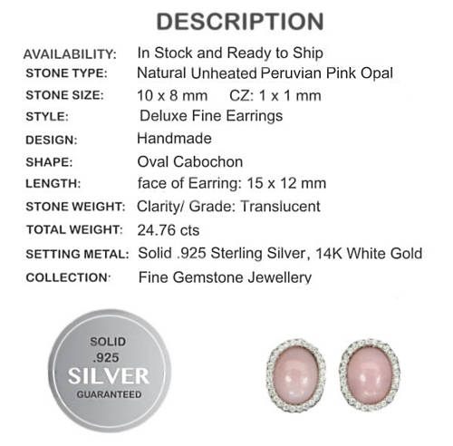 HANDMADE UNHEATED PERUVIAN PINK OPAL AND WHITE CUBIC ZIRCONIA GEMSTONE EARRINGS
