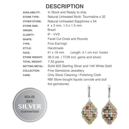 These Natural Unheated Multi-Tourmaline and Sapphires Solid 925 Sterling Silver Earrings are a unique and striking addition to your jewelry collection. They feature an impressive 86 gemstones, including 32 tourmaline and 54 sapphires, and are separated with delicate silver florals. For an elegant yet eye-catching look, these earrings are the perfect choice.