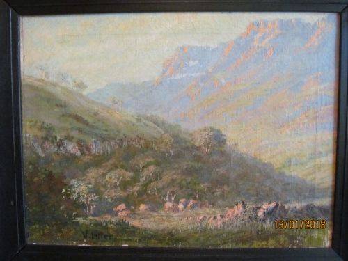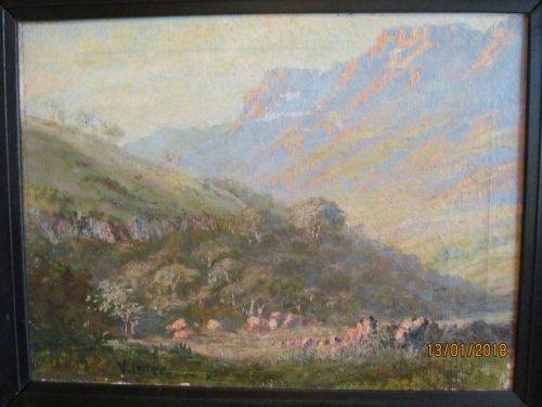 FRAMED IN A BLACK PAINTED WOOD SCOOP FRAME, THIS BEAUTIFUL AND ANCIENT RENDERING OF A SMALL PORTION OF SOUTH AFRICA'S MAJESTIC MOUNTAIN RANGES DEPICTS THE ABSOLUTE MAGNIFICENCE OF NATURE'S OWN ABILITY TO PRODUCE BREATHTAKING SCENERY WHICH THIS TALENTED ARTIST HAS SET DOWN ON CANVAS AND MEMORIALIZED IN OILS.