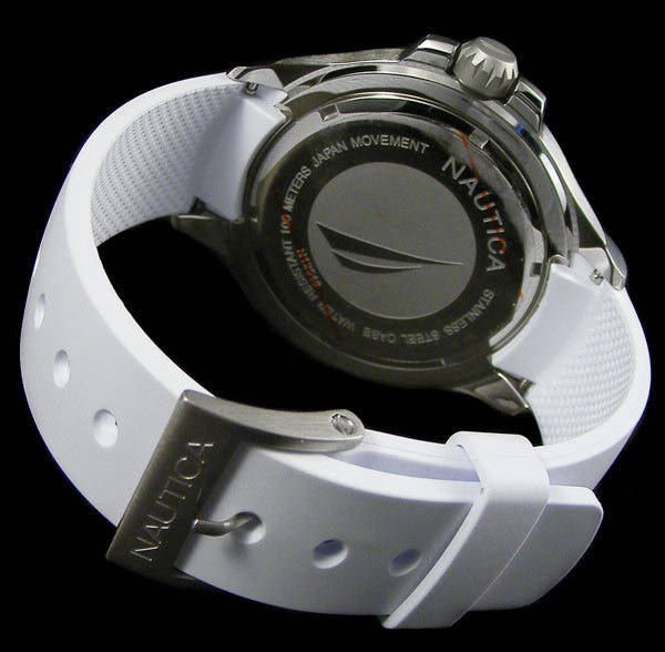 White Nautica signed rubber band with brushed stainless steel buckle.