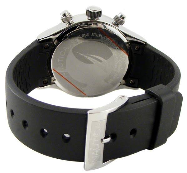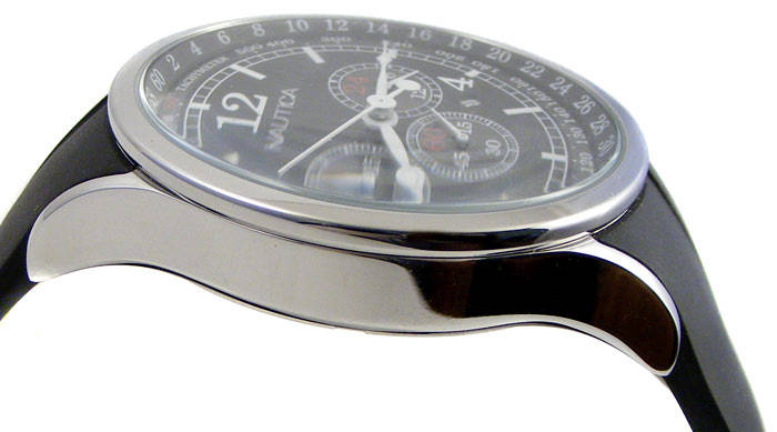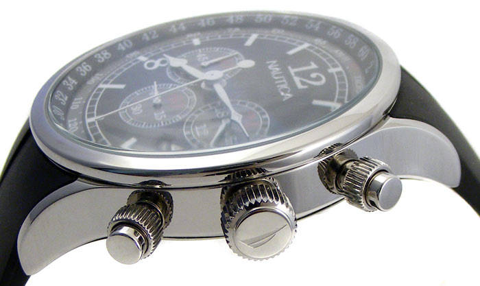 Polished stainless steel case with screw in stainless steel case back and screw lock Nautica signed crown.