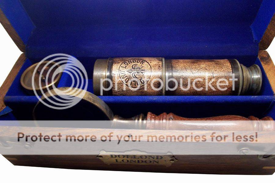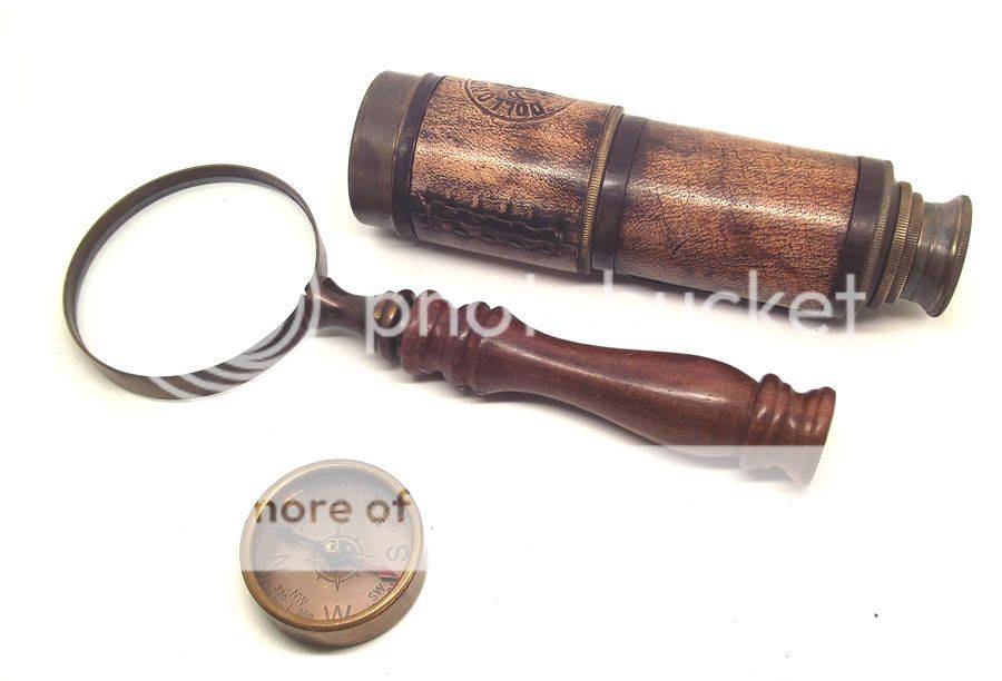 LARGE SIZE DOLLAND LONDON NAUTICAL BRASS GIFT SET IN A FINE ROSEWOOD CASE. 17-INCH LEATHER-COVERED FOLDING PIRATE TELESCOPE, 1.25" FUNCTIONAL COMPASS & 40 mm 7-INCH MAGNIFYING GLASS. ALL ITEMS ARE LARGE SIZE & FULLY FUNCTIONAL . LIMITED EDITION, HIGH-GRADE FINISH.