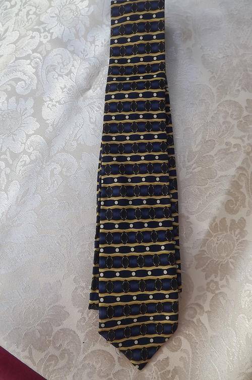 Navy Silky Tie with Mustard Colour Stripes and Patterns - width 6.2cm - as new