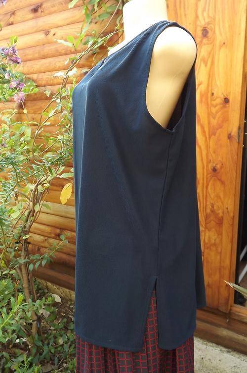 Navy sleeveless corded stretch polycotton top with slitted sides.Size 42/18.Rounded neckline
