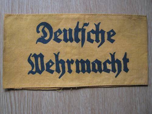 PHYSICAL DESCRIPTION: Roughly, 9.5 cm wide and 19.5 cm long, woven, yellow cotton construction armband with machine woven, black, Gothic script in two lines to the obverse, "Deutsche Wehrmacht", (German Armed Forces). The top and bottom edges of the armband have interwoven rows of tight reinforcement stitching and the reverse of the armband has a machine stitched, vertical seam. The armband is in overall very good condition with minor age and usage toning