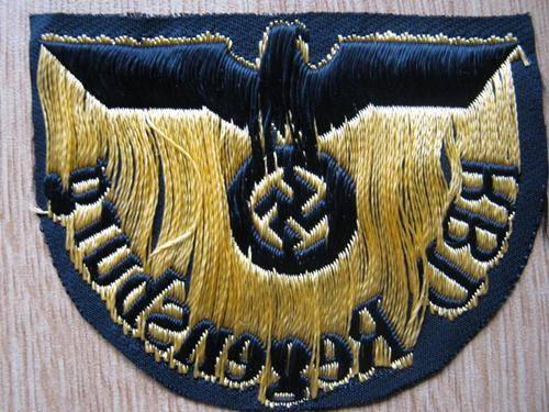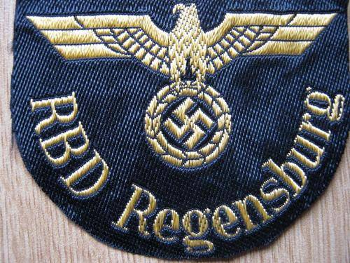 PHYSICAL DESCRIPTION: A machine woven, right facing eagle with outstretched wings and a wreathed, mobile swastika in its talons, positioned above the arching script, "RBD Regensberg." All of the threads are bright golden-yellow, against a half-moon shaped, woven black base, it is 8 cm x 6 cm The insignia indicates service with the "