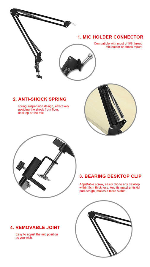 1. Professional recording microphone stand, foldable and removable, easy to adjust the microhone positon as you wish. 2. This stand has the advantage of strong bearing capacity, it can support 3kg microphone. 3. Adjustable positioning screw, easily clip to any desktop within 5cm thickness. 4. Metal texture makes it durable.