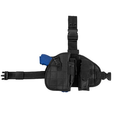 • The multiple piece MOLLE Drop Legs system that is completely customizable. This system includes a Drop Leg Panel with MOLLE webbing, a MOLLE (RH) Pistol Holster is a composite design with tough quilted PVC outer fabric making this a very durable holster, and a 2nd Pistol Magazine Holster with MOLLE straps. The Holster features an adjustable Quick Snap Buckle to secure your pistol in the holster, a single Magazine Pouch on the front edge of the holster, an adjustable slip resistant Thigh Straps with Quick Release Buckle, adjustable for height Drop Leg Strap with Quick Connect Buckle, and dual Belt Loops with thumb snaps.