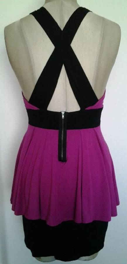 Description | Colour blocked peplum dress with halter neckline and crossover straps to the back. |