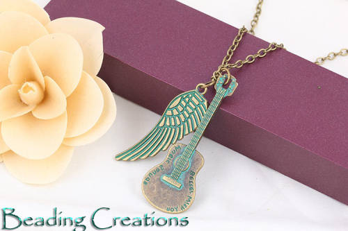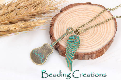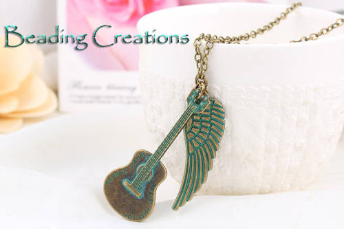 NECKLACE WITH CHAIN - RETRO FASHION - BRONZE - GUITAR AND ANGEL WING - 430mm