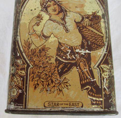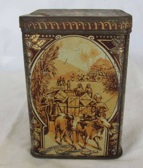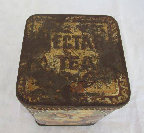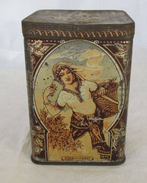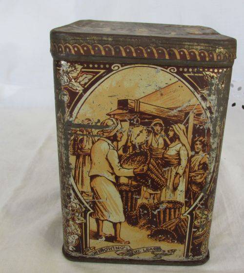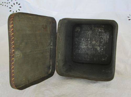 CONDITION: Well used. Lid still fits properly. SIZE: 10.2 cm X 10.2 cm X 14.5 cm.