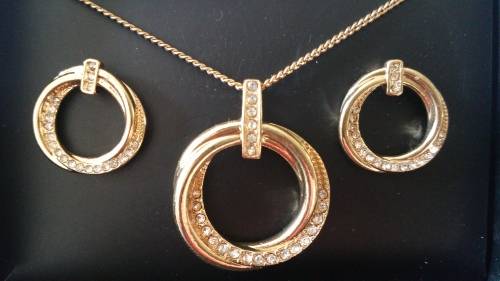 Gold toned intertwined pendant with diamante on an extended chain.