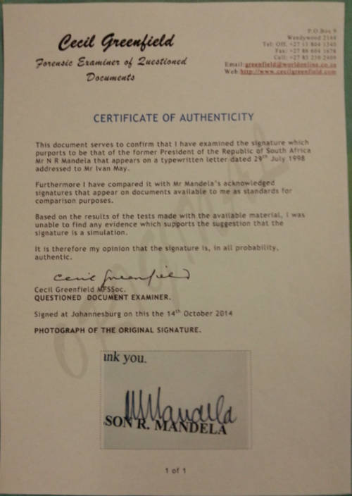 YOU ARE BIDDING ON A LETTER THAT WAS WRITTEN BY FORMER PRESIDENT NELSON MANDELA ADDRESSED TO DR IVAN MAY DATED 29 JULY 1998. THE LETTER IS SIGNED BY MR. MANDELA AND WAS TYPED ON HIS PRESIDENTIAL LETTERHEAD/STATIONERY.