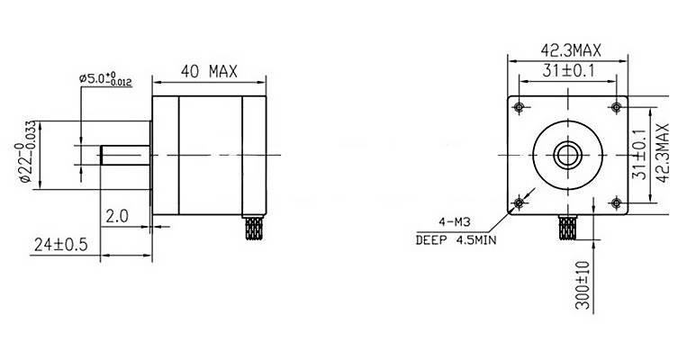 Model | Step Angle ( ° ) | Motor Length (mm) | Rate Voltage (V) | Rate Current (A) | Phase Resistance (Ω) | Phase Inductance (mH) | Holding Torque (kg.cm) | Lead Wire (NO.) | Detent Torque (g.cm) | Motor Weight (KG) |