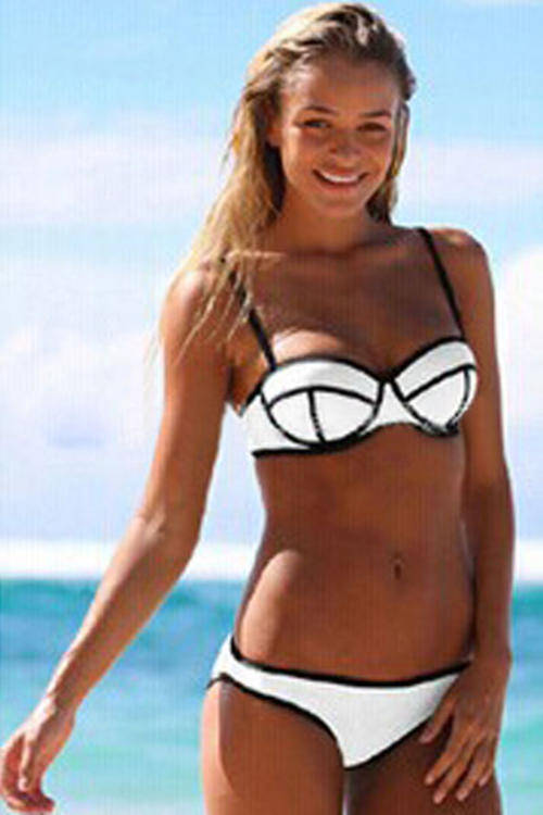 Two-piece bikini set  Clip hook bra fastener In neon colour with black trimming and detailing Removable straps.