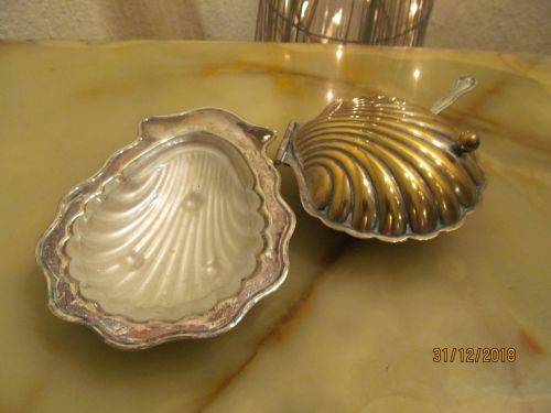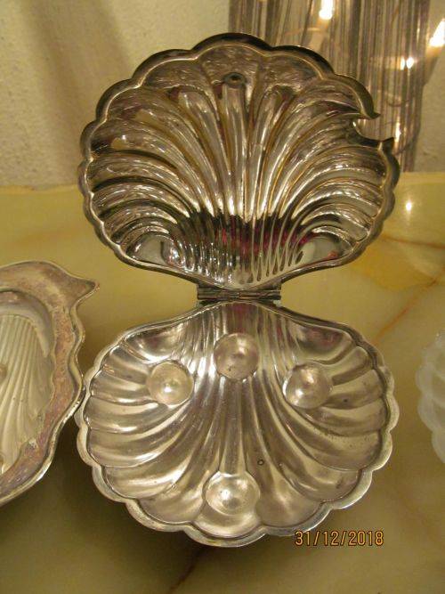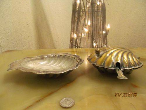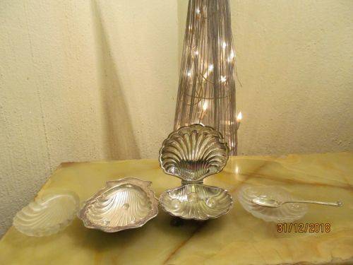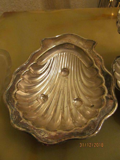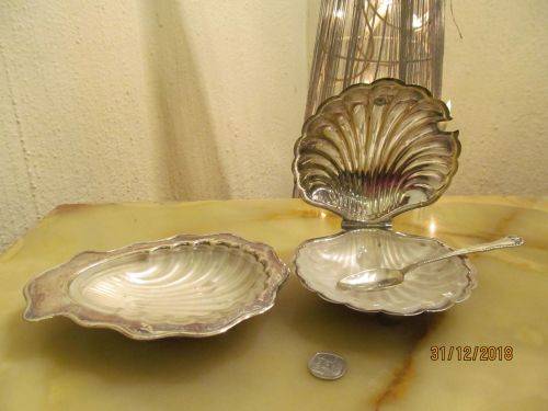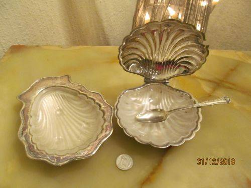 CONDITION : THE LIDDED SHELL DISH HAS LOST MOST OF ITS SILVER PLATING RESULTING IN BRASS SHOWING. BOTH GLASS INNERS HAVE SOME SMALL CHIPS ON THEIR RIMS WHICH ALTHOUGH CANNOT BE SEEN, CAN BE FELT WITH A FINGERTIP. THE ITEMS MAY ALL REQUIRE POLISHING DUE TO AGE RELATED VINTAGE PATINA. ASIDE FROM THIS THE ITEMS HAVE NO RUST, DENTS, DAMAGES ETC