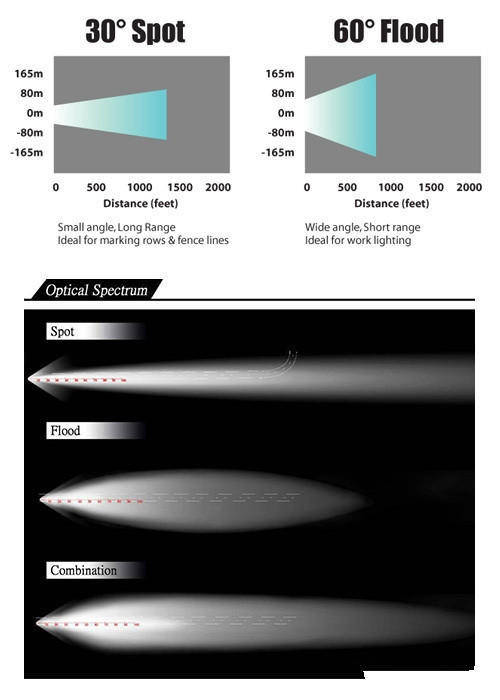 Spot/Flood Beam Combo: Spot/ Flood beam combo pattern to have the best light beam result: with the widest angel to be seen and still very bright in the center