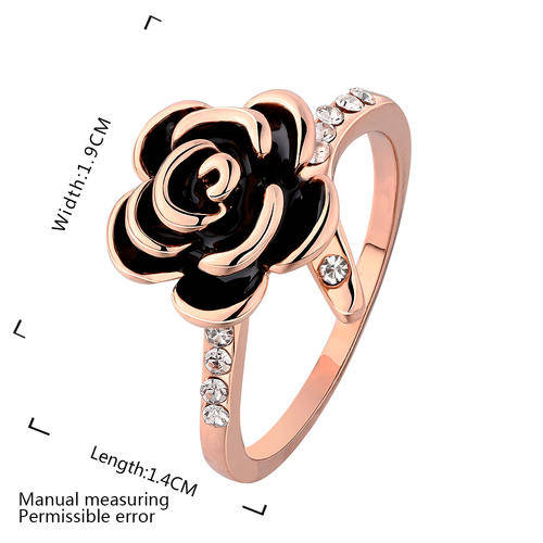 New 18K RGP in rose gold, Ladies rose deign ring with black detail and Genuine Austrian crystals