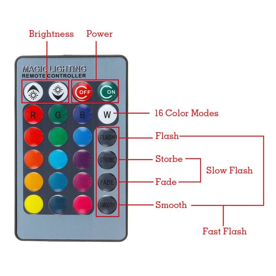- 16 Color mode with touch button switch and remote controller. can control the light both by the touch button and remote controller.