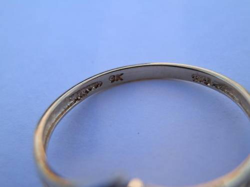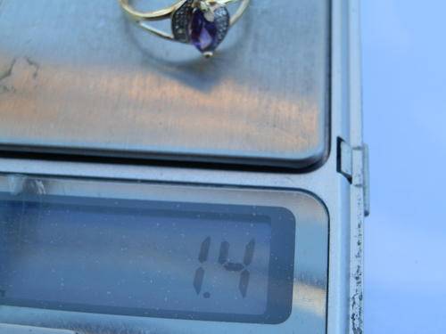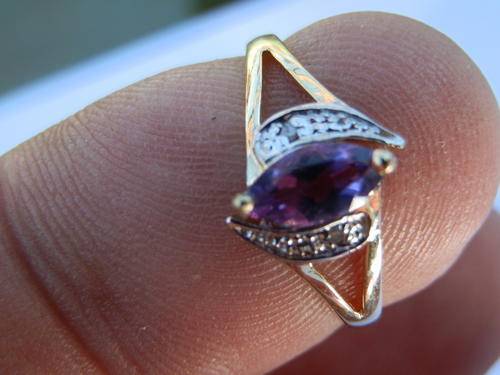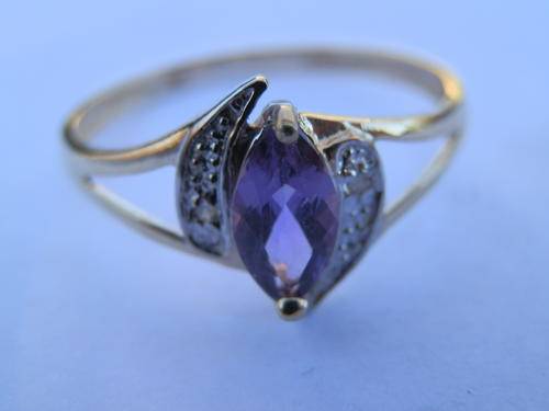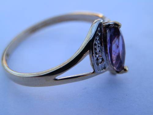 Gorgeous 9 ct gold amethyst and diamond ring, marked 9K, size O / 7.5 with a head width of 10 mm and weight of 1.4 g. The size of the amethyst is 4 x 6 mm and the two diamonds 1 mm diameter each. What a stunning piece.