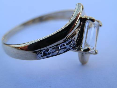 Stunning 9 ct gold aquamarine and diamond ring, marked 9 K, size N+ / 7+ with a head width of 12 mm and weight 1.4 g. The size of the aquamarine is 4 x 6 mm and the six diamonds about 1 mm diameter each.
