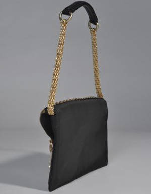 It features - Nylon material, main compartment with magnetic flapover closure, large external pocket and interior zippered and open slots. Plus a beautiful gold studded detail on the flap.