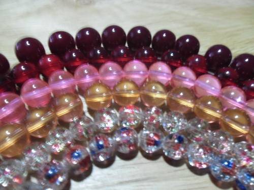 1 String of 30 Large Maroon Beads, 1 String of 30 Large Red beads, 1 Srting of 30 Large Light Pink Beads, 1 String of Large Peach beads, 1 strig of specked two tone beads Pink/Clear, 1 string of specked three tone beads red/blue/clear. TOTAL BEAD = 200 (10mm and 8mm beads)