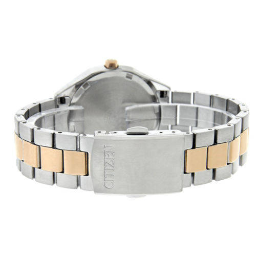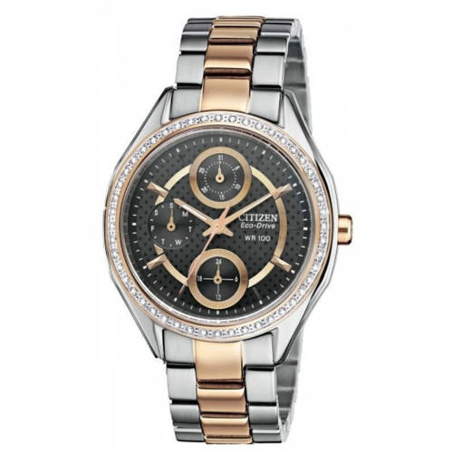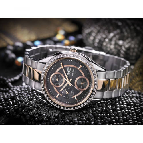 Citizen FD1066-59H POV 2.0 Drive women's watch features a 34mm wide and 9mm thick solid stainless steel case with Swarovski crystal accents rose gold tone fixed bezel and a push-pull crown. Citizen FD1066-59H is powered by an accurate eco-drive 8637 movement. This beautiful watch also features a sharp looking grey dial with white accent rose gold tone luminous hands and hour markers along with the dual time and day-date display functions, scratch resistant mineral crystal, and water resistant to 100 meters. Citizen FD1066-59H is equipped with a 16mm wide two tone rose gold ion plated solid stainless steel bracelet with a push button fold-over deployant safety clasp. Citizen FD1066-59H women's POV 2.0 Drive Swarovski crystal eco-drive two tone bracelet watch is brand new and comes in an original Citizen gift box and is backed by a 1 years Dealer warranty.