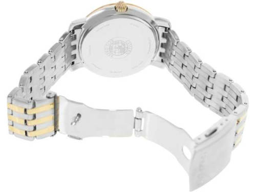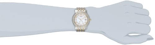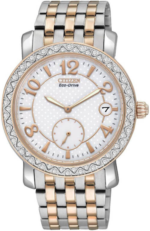Citizen EV1016-58A TTG2.0 Drive women's watch features a 38mm wide and 10mm thick two tone rose gold ion plated solid stainless steel case with a Swarovski crystal accents fixed bezel and a textured push-pull crown. Citizen EV1016-58A is powered by an accurate eco-drive B690 movement. This beautiful watch also features a milky white dial with white accent rose gold tone luminous hands and hour markers along with the date display functions, scratch resistant mineral crystal, and water resistant to 30 meters. Citizen EV1016-58A is equipped with a 19mm wide two tone rose gold ion plated solid stainless steel bracelet with a push button fold-over deployant safety clasp. Citizen EV1016-58A women's TTG2.0 Drive two tone stainless steel eco-drive watch is brand new and comes in an original Citizen gift box and is backed by a 1 year warranty.