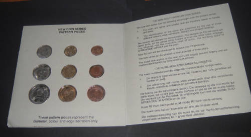 These were the pattern coins for the 1c, 2c, 5c, 10c, 20c, 50c, R1, R2 and R5 coins that were introduced as our 3rd decimal coin series in 1990.
