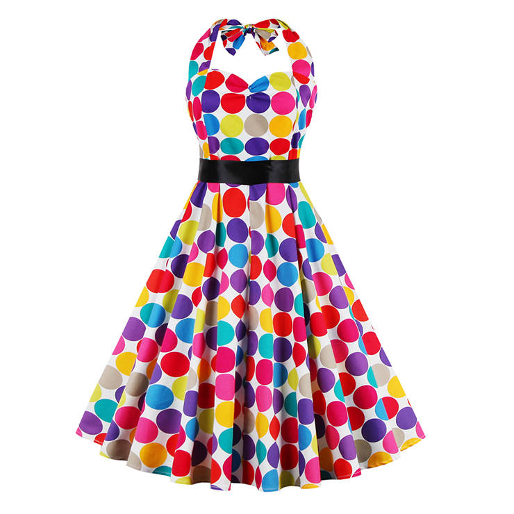This fashion colorful casual swing dress features:halter sweetheart neck,high waist design, unique A-line swing dress, lovely coloful polka dot pattern makes you out of the crowd,matching black ribbon waist band.