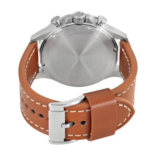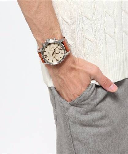 Stainless steel case with a light brown leather strap. Fixed bezel. Beige dial with brown hands and index- Arabic numerals hour markers. Minute markers around the outer rim. Dial Type: Analog. Luminescent hands. Date display between 4 and 5 o'clock position. Chronograph - sub-dials displaying: three- 60 seconds, 30 minutes, and 24 hours. Quartz movement. Scratch resistant mineral crystal. Screw down crown. Solid case back. Case diameter: 50 mm. Case thickness: 12 mm. Round case shape. Band width: 24 mm. Buckle clasp. Water resistant at 100 meters / 330 feet. Functions: chronograph, date, hour, minute, second. Sport watch style. Fossil Nate Beige Dial Mens Chronograph Watch JR1503.