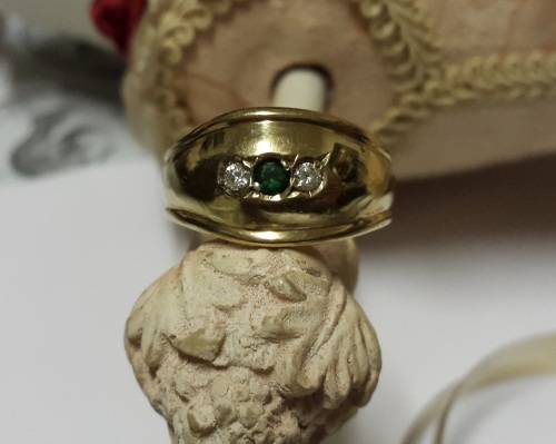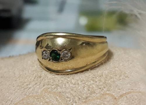 9ct gold ladies ring with clear cubic zirconia and green center stone