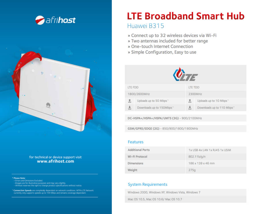 - Device is Telkom Branded but works across South Africa's various Mobile Networks