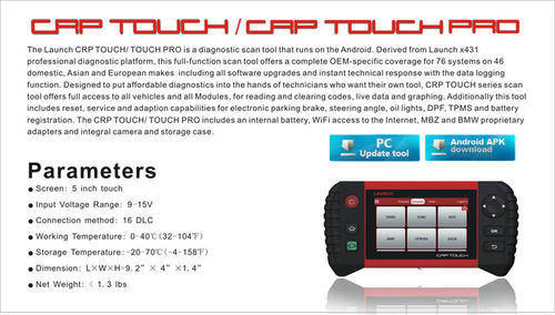The Launch CRP TOUCH Designed to overcome the financial barrier of owning your own diagnostic tool, CRP TOUCH offers you a complete OEM system coverage you’d find on the Launch flagship products like X431 PAD II and X431 ScanPad701, plus third party add-on features applied only on Android platform, so you will be ready for every vehicle that rolls into your bay. You get OEM-specific electronic module accessibility for domestic, Asian and European vehicles with the expert insight for a confident diagnosis.