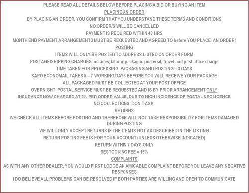 R35.00 Standard shipping using one of our trusted couriers applies to most areas in South Africa. Some areas may attract a R30.00 surcharge. This will be calculated at checkout if applicable. Check my rate