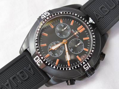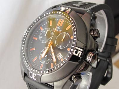 Chronograph with a date window at 4 O,Clock, and a subtle black dial with three sub-dials.seconds/24hours/minutes elapsed/stopwatch.
