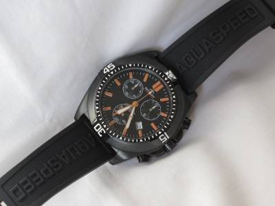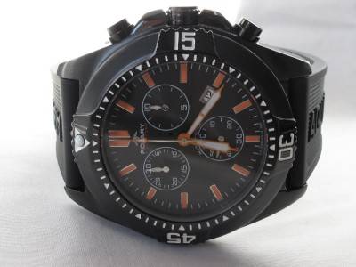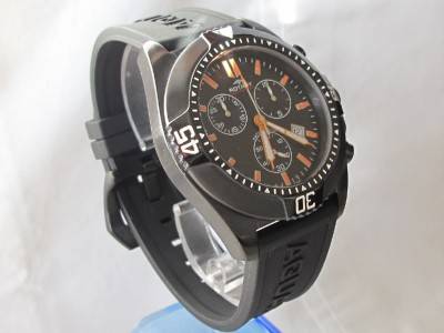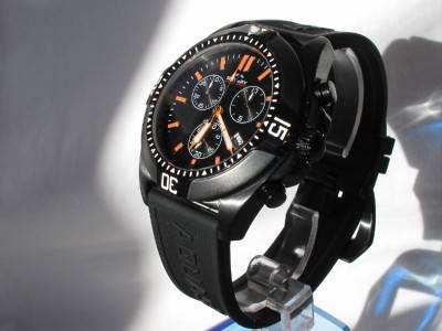 Black face/dial and orange and luminous coloured hands and hour markers,