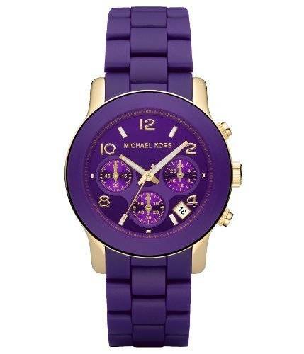 Watch features gold-tone stainless steel case with a rubberized purple bezel. Purple polyurethane bracelet wrapped around gold links. Purple toned chronograph face with gold accents, date window and three subdials, all covered by scratch resistant mineral crystal. Crown is engraved with MK logo. Folding hidden clasp closure.