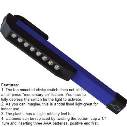 Use for working on electronics, emergency roadside repairs or multi-purpose work light. Compact design provides floodlight quality, yet fits in your pocket, glove box, tool belt -water and shock resistant. Powered by 3 x AAA batteries - NOT included!. Available in the following colours: Red; Blue; Pink & Black!