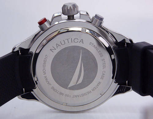 Genuine Nautica Black Rubber Strap with Nautica Name Print & Logo. Stainless Steel Buckle Clasp with Nautica Name Print.