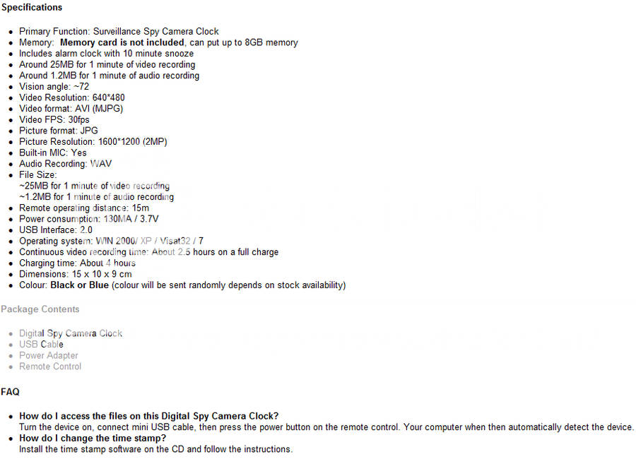 Motion Detection Video Recording: This Digital Spy Camera Clock can be set to record video only when an object passes in front of the lens. That means you can leave this surveillance/spy gadget in front of your desk and see who has been going through your things! Remote Picture Snapshots: More one-button goodness from this Digital Spy Camera Clock - now, you can take instant picture snapshots! It doesn't get easier when you need photographic evidence or need to secretly spy on someone!