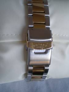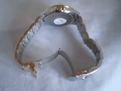 Brushed two-tone stainless steel and gold-plated bracelet, with folding push-button safety clasp. Will fit wrist up to 20.5cm approx. and has removable links and fine adjustment on clasp.