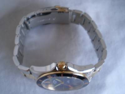 All stainless steel case with blue/gold-plated bezel, screw-down crown and case back. Measures approx. 41mm across (excluding the crown)